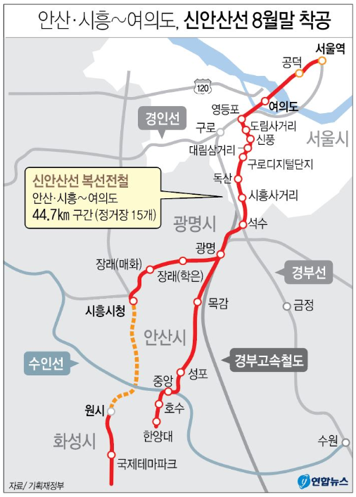 신안산선은 광명·안산~여의도를 연결하는 수도권 광역전철로, 서남권 출퇴근 시간 단축이 핵심 목표입니다. 특히 광명역~여의도 구간은 20분 내외로 단축되어 광명시민, 안산시민들의 서울 접근성을 크게 높입니다.