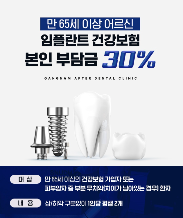 현재 건강보험을 통한 임플란트 혜택은 만 65세 이상의 건강보험 가입자 및 피부양자에게 제공됩니다. 즉, 65세 생일이 지난 이후부터 건강보험 혜택을 받을 수 있습니다.