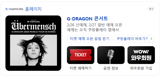 💡 지드래곤 콘서트 티켓 예매는 쿠팡플레이 모바일 앱을 통해 독점적으로 진행됩니다. 예매 일정은 다음과 같습니다: