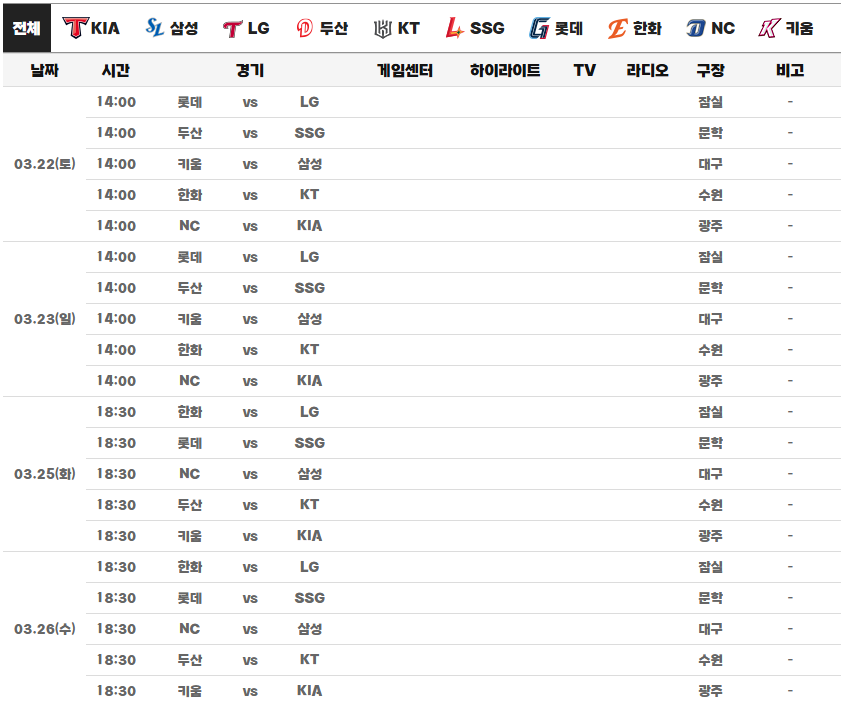 2025년 KBO 리그 시범경기는 3월 8일부터 3월 18일까지 진행되며, 각 팀은 10경기씩 총 50경기를 치르게 됩니다. 개막전 대진표는 다음과 같습니다.
