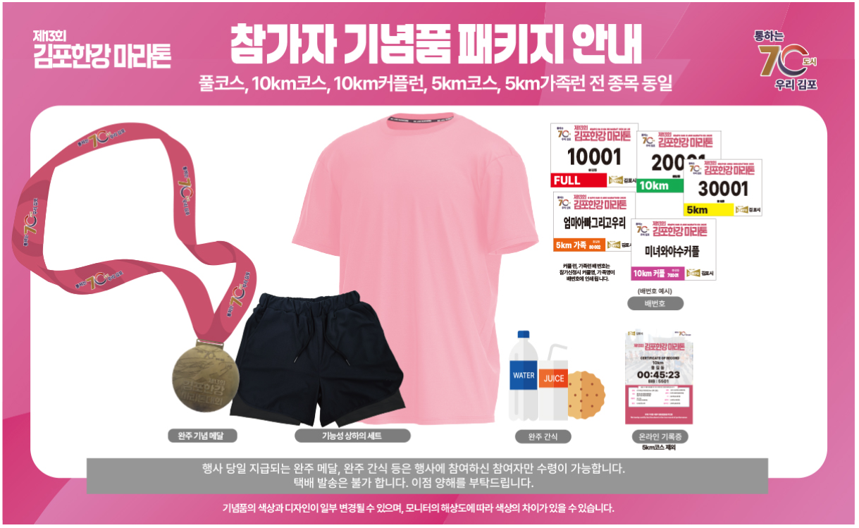 - 완주 메달: 풀코스, 하프코스, 10km, 5km 참가자 전원에게 지급