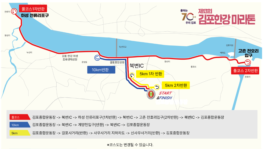 | 풀코스 | 42.195km | ★★★★☆ | 한강을 따라 김포의 자연경관을 감상할 수 있는 코스 |